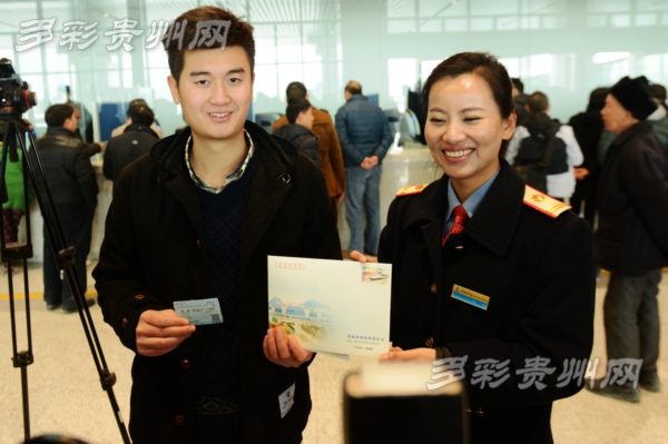 同時,黎勝明還收到了貴陽北站贈送給他的首日封,里面有著一張明信片,正面是貴廣高鐵與沿線的當地少數民族合照,背面則是鐵路的訂票過程及留言處。貴陽北站客售車間總支書記孫夢妮表示,這個首日封是贈送給第一個買到貴廣高鐵實體車票的旅客,以此來紀念貴州的第一條高鐵。(楊昌鼎 車璐)