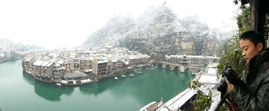 背著相機的攝影師們,在這一天早晨里把鎮(zhèn)遠古城走了個遍。有的攝影師還冒出危險走上高山拍攝大雪天的古城勝景。(何昌華 攝影報道)