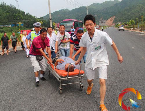 本網訊 為增強道路交通突發事件應急救援能力,6月26日上午,鎮遠縣交警、消防、衛生、安監、交通、保險公司、客運公司等部門在鎮石線小田溪段,聯合開展了客運車輛突發事件應急救援演練。圖為醫護人員、救援民警、群眾爭分奪秒搶救中暑旅客。(龍冠宇)