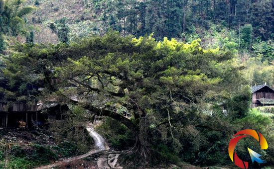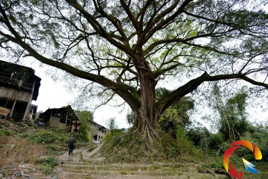 這株古榕樹位于都柳江畔下江鎮(zhèn)民族村寨邊,有210年樹齡,胸徑232cm,占地約2000多平方米,樹枝分4杈,其中西面靠近村寨的一杈,目前正在換新葉,而其它3杈卻是綠葉青青。