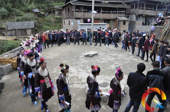 本網訊 2015年2月25日,農歷正月初七下午,從江縣西山鎮卡翁村卡架自然寨迎來了該鎮春節期間第一個“吃相思”活動,來自丙妹鎮長寨村男女老少近180人的“做客”大軍進入寨門,開始了侗族古樸獨特的吃相思風俗。