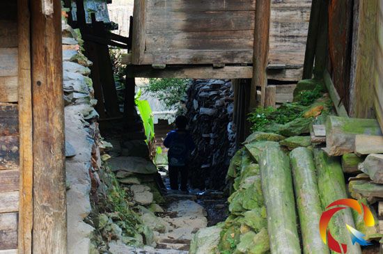 從江縣加榜鄉(xiāng)加車村一小孩從房屋間走過