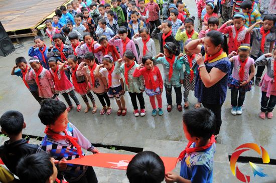 從江縣加榜鄉(xiāng)黨扭小學(xué)學(xué)生為愛心人士佩戴紅領(lǐng)巾