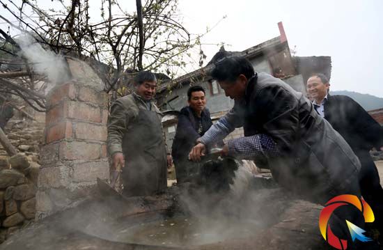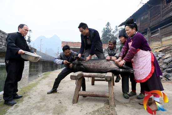 本網訊 當日是春節前傳統的“小年”,“殺年豬”是丹寨縣廣大苗族村民喜迎春節的習俗。每到年關,當地的村民都會集合全家人一起把家里養了一年的豬拿出來宰殺,用豬肉做成年貨,并請來親朋好友歡聚一堂,大宴一餐,稱為吃“刨湯”。(黃曉海)