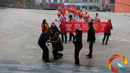 2015年1月19日,朱曉陽在其父母親人的陪同下,舉著“寶貝回家”的橫幅,拿著寫有“警察顯神威 一心為人民”的錦旗,帶著敲鑼打鼓的隊伍,來到黃平縣公安局,為黃平縣公安局送來錦旗,表達了他們的感激之情。(羅錦莉)