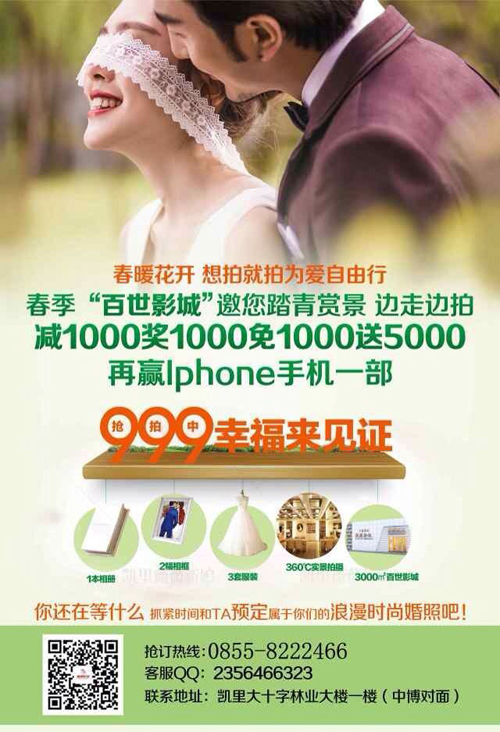 2、訂全家福、藝術照339元起僅此一次的開年推廣大優惠,要抓緊機會咯!訂單成功的新人們將有機會獲得3月29日百世影城——幸福游園活動僅限200名額哦!