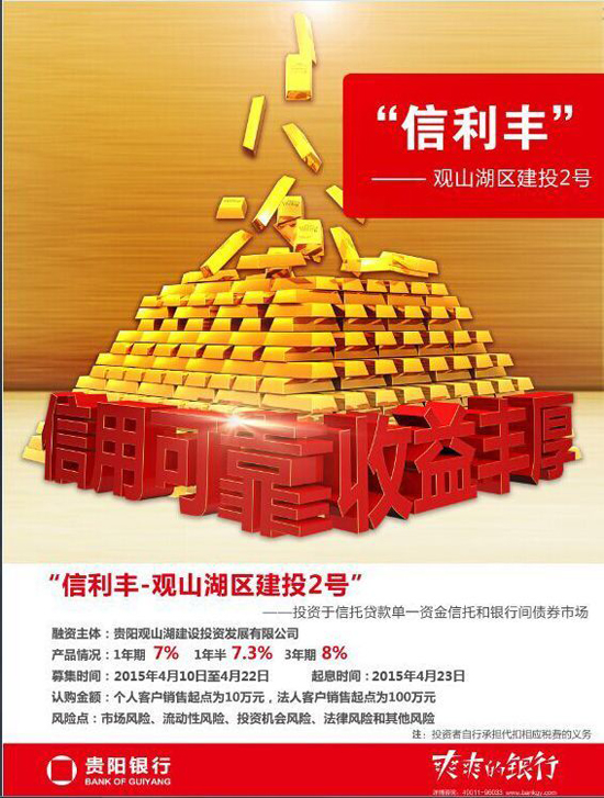 “信利豐-觀山湖區建投2號”于4月10日開始募集,共有三款產品,不同的期限,滿足您的投資需要,為您專業理財,3款產品任君選擇。募集時間均為2015年4月10日-4月22日,4月23日起息。