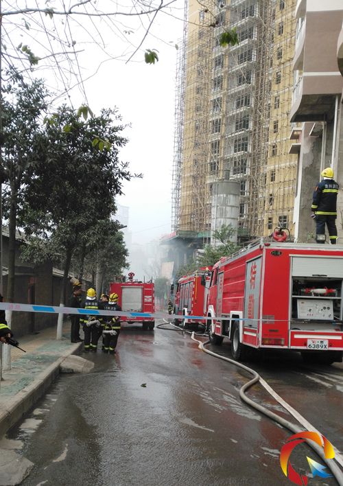 下午5時許,記者在事發現場看到,大量煙霧從著火的樓層里噴出,民干路上空濃煙滾滾,黑壓壓的一片。