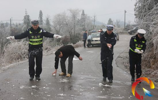 在冰凍期間,民警晝夜堅守、連續工作近70個小時,出動警力180人次,排查凝凍結冰路段21條,設置安全提示牌36塊,勸返引導車輛440余輛次。