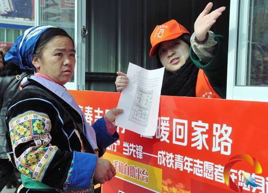 據悉,2月4日春運以來,凱里火車站設立了由11所大學28名在讀大學生組成的青年志愿者服務隊,每人至少會一門語言。他們用苗語、侗語、漢語和外語等多語為為老弱病殘孕、國內外旅客和當地少數民族旅客提供交通指南、車票導購、候車乘車、改簽退票、行李搬運、送開水及提供咨詢等服務。這些貼心的服務讓緊張的春運工作充滿了濃濃的人文氣息,也體現了鐵路對旅客親人般的關懷。