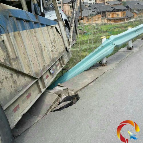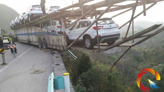 接到報警后,凱里路政執(zhí)法大隊路政員立即趕赴現(xiàn)場,掛車后半部已沖出高速公路,懸在高填方坎邊,情況十分危險。路政員詢問得知,此掛車是從湖南運送商品轎車前往貴陽,行駛至此坡時,馬力不足,倒退回來才沖出高速公路的。