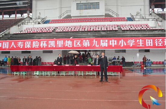 在開幕式上,市教育科技局機關黨委書記龍福安主持開幕式,市文體廣電旅游局黃大慶副局長致詞。凱里市人民政府劉仁翔副市長宣布:中國人壽保險杯凱里地區第九屆中小學生田徑運動會開幕。大會組委會希望全體運動員牢固樹立“安全第一、友誼第一、比賽第二”的思想,發揚“更高、更快、更強”的奧林匹克精神,勇于拼搏、賽出水平、賽出風格,要求裁判員和工作人員把忠心獻給學校、把愛心獻給學生,把責任獻給大會,努力把本屆運動會辦成一次“安全、文明、拼搏、奮進”的盛會。