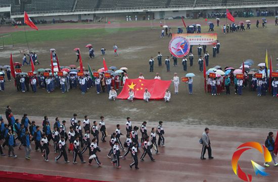 8時25分,運動會入場式開始。天空雖然下著細雨,但隨著雄渾高亢的樂曲,運動會護旗手精神抖擻抬著鮮艷的五星紅旗首先進入運動場,緊接著會徽隊、會標隊閃亮登場,隨后小學組26支代表隊、中學組25個代表隊、高中8支代表依次進入主會場。解說員分別對各代表隊進行了熱情洋溢的介紹。