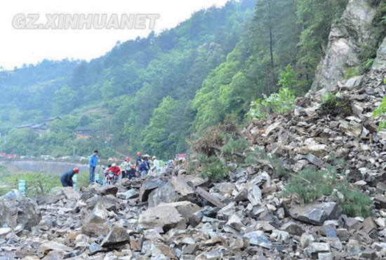 4月29日日,貴州省308省道凱里市境內(nèi)一路段發(fā)生山體滑坡,滾落的石頭將約20米的公路路面堵塞,造成交通暫時中斷。