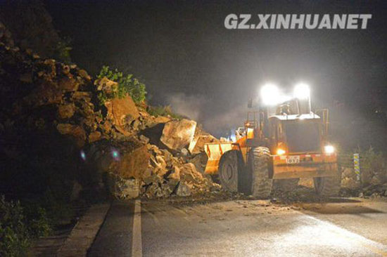 凱里公路管理局接報后,組織公路搶險人員利用大型機械于晚20時許搶通半幅路面,恢復(fù)車輛通行。(陳沛亮)