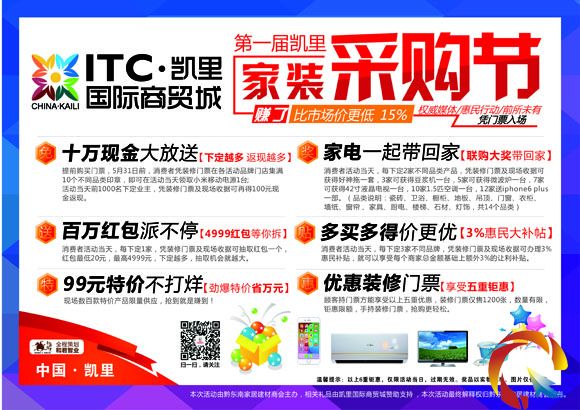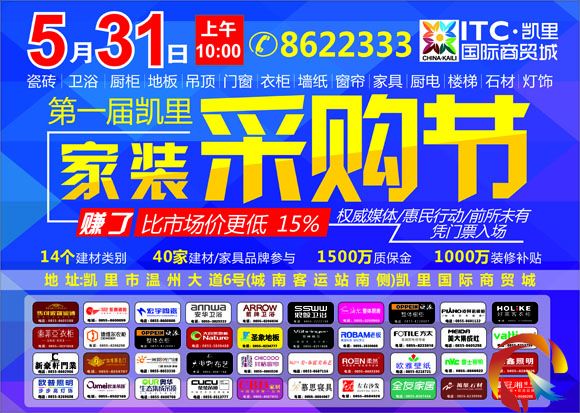 本網(wǎng)訊 (記者 楊懿)記者日前從凱里國際商貿(mào)城獲悉,第一屆凱里家裝采購節(jié)將于5月31日在凱里盛大開幕。屆時,將有14個建材類別,40家建材家居品牌匯集凱里國際商貿(mào)城(凱里市溫州大道6號),讓您一站式輕松解決裝修問題。