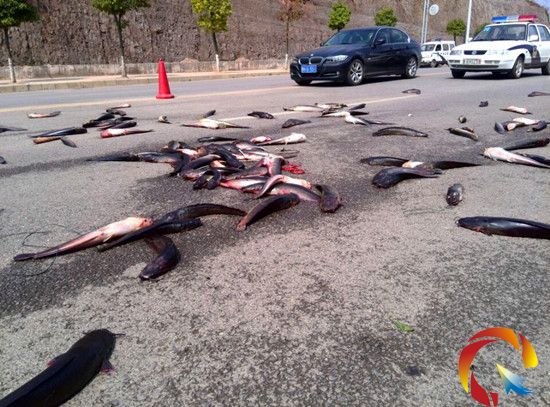 運(yùn)魚(yú)車泄漏 上千條魚(yú)橫躺大街(組圖)