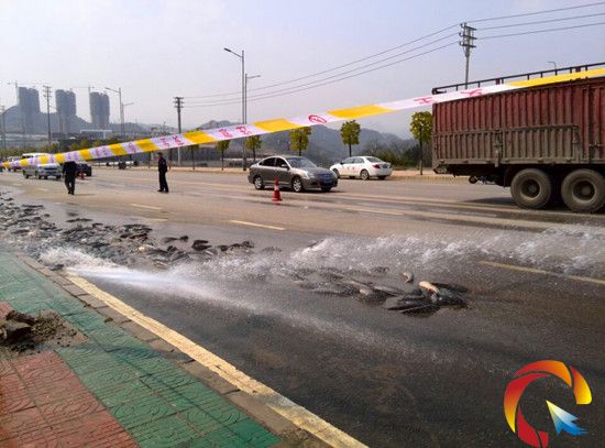 記者了解到,運(yùn)魚(yú)車是從廣西南寧開(kāi)往凱里的,運(yùn)魚(yú)車司機(jī)崔師傅告訴記者,17日中午12點(diǎn)40分左右發(fā)現(xiàn)魚(yú)從車上漏出來(lái)的。