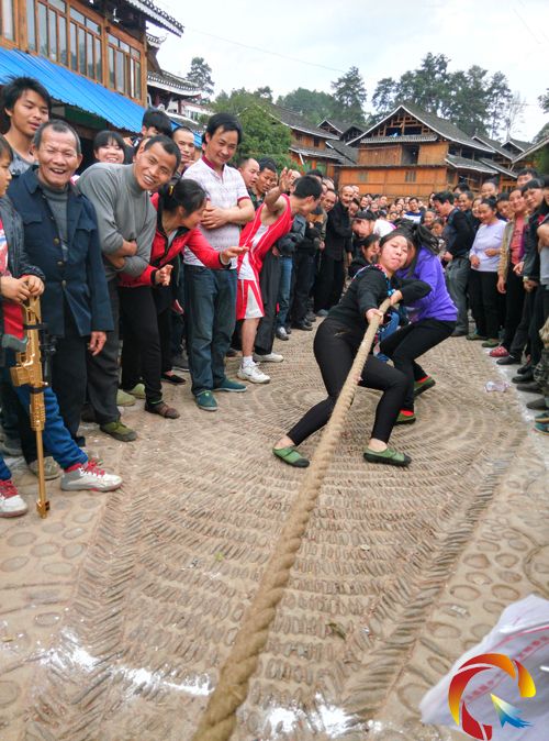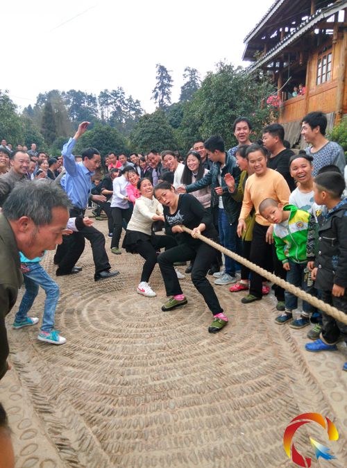 地青村包括地青、平蒲兩個侗寨,是國家級森林公園的核心區域,這里民族風情古樸濃郁,侗族服飾文化、飲食文化豐富獨特,嫻麗多彩。為宏揚當地民俗民間文化,豐富廣大群眾的節日文化生活,富裕起來的地青村廣大群眾敲起豐收的鑼鼓,跳起喜慶的舞蹈,開展祭薩、踩歌堂、廣場舞比賽、拔河比賽、籃球比賽等一系列民俗活動和文體活動,共同慶祝新春佳節。從大年初一開始當地祭薩、踩歌堂、等傳統活動相繼拉開,各團群眾抬著豬頭等祭祀貢品載歌載舞拜祭薩歲,祈求國泰民安、風調雨順、五谷豐登,同時,上千群眾高奏蘆生,敲鑼打鼓來到軍屬和臺胞臺屬家里帖春聯、拜大年。而當地開展的文體活動更是精彩紛呈,紅紅火火、有聲有色、熱鬧非凡,女子拔河的比賽現場上,娘子軍們一顯身手,鉚勁十足,互不相讓。村民的加油聲此起彼伏,一浪高過一浪,據了解從大年初一開始地青村天天有精彩活動,當地群眾在歡聲笑語中盡情表達他們建設新農村、享受新生活的喜悅之情,圖為群眾鉚勁拔河的精彩現場。(石光照)