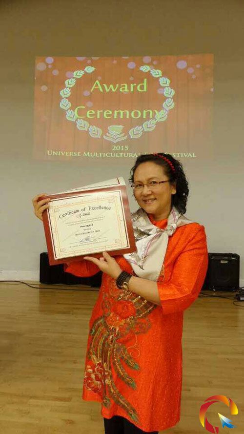 著名兒童電影導(dǎo)演酈虹在展示獲獎證書