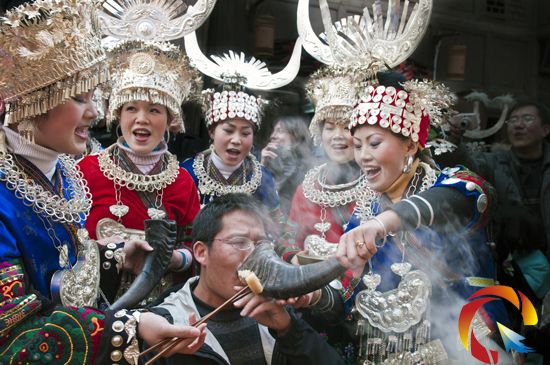 哦,對(duì)了,在貴州雷山有一句名言:雷山是酒鄉(xiāng),走到哪鄉(xiāng)喝哪鄉(xiāng),米酒甜,米酒香,喝了之后醉苗鄉(xiāng)。到苗寨,一定要喝酒哦,不喝是不禮貌的,雷山最出名的酒文化就是十二道攔門酒,記著,不要單手或雙手去接牛角杯或其他酒杯,如接了,對(duì)方會(huì)認(rèn)為你是海量,于是姑娘就放手了,牛角杯或其他酒杯的酒就是你的了。不喝也不行,抿一口意思就行了。