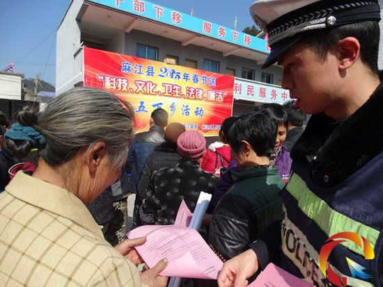 本網(wǎng)訊 春節(jié)即將來臨,農(nóng)民工返鄉(xiāng)、學(xué)生回鄉(xiāng)、探親訪友人流增多,為加強(qiáng)春節(jié)期間道路交通安全工作,預(yù)防和減少各類安全事故發(fā)生,近期以來,麻江縣交警大隊(duì)組織大批交警到各鄉(xiāng)鎮(zhèn)公路、街道、集市等場(chǎng)所開展交通安全宣傳。圖為2月12日麻江交警在景陽村五下鄉(xiāng)活動(dòng)現(xiàn)場(chǎng)向村民開展交通安全知識(shí)宣傳。(李興義)