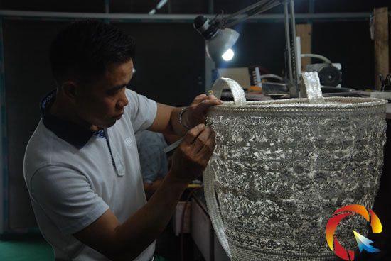 銀背簍不可能像竹編背簍那么容易,據工匠們介紹,工藝中最難的不是讓人眼花繚亂的各類圖騰,而是背簍的兩條背帶及框邊部位,由于從未嘗試過銀條編織,這其中的工藝難度和銀條的調配加工,又讓大伙琢磨了一個月,為了編好銀帶子,工匠們事先用銀條,試著編織籃子造型,經過一遍遍的嘗試,才攻克下難度系數最大的框邊和背簍帶子。