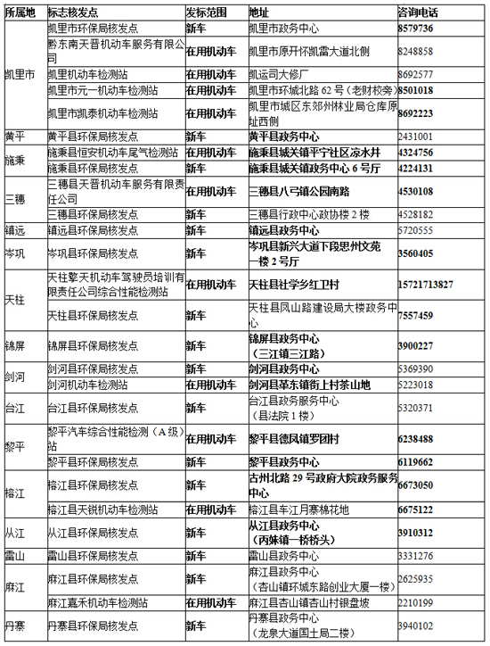 黔東南州機動車環保合格標志核發點一覽表