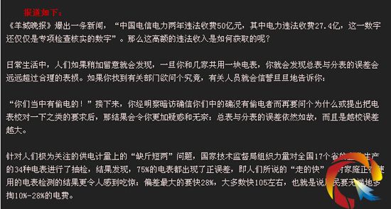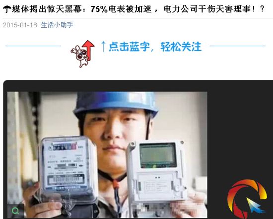 本網(wǎng)訊 (記者 劉承宇) “媒體揭出驚天黑幕:中國75%電表都被蓄意加速”近期,一則標(biāo)題勁爆的微信再次在微信圈引起人們廣泛關(guān)注。網(wǎng)帖稱,南方某報(bào)調(diào)查發(fā)現(xiàn),中國75%電表都被蓄意加速,國家電網(wǎng)公司兩年違規(guī)收費(fèi)27.4億元。