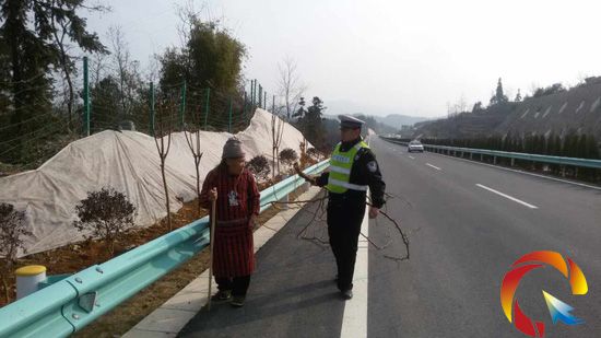2015年1月16日15時,黔東南州交警支隊高速大隊十中隊民警巡邏至余安高速余凱段黃平至余慶方向38km+400m處時發現,高速路邊一名頭發花白的七旬老嫗拖著一棵樹枝在高速公路超車道上行走。
