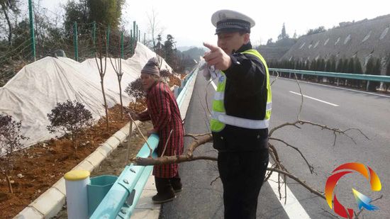 巡邏民警立即停車做好警示標識后前往老嫗處詢問情況,經了解,老嫗為了圖方便所以抄近路上高速行走,民警幫老嫗把樹扛出高速后,告知老嫗行人上高速很危險而且是違法行為,老嫗表示知道了自己的行為很危險下次再也不上高速。(魏文俊)