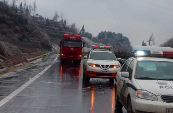 本網(wǎng)訊 1月31日凌晨,黔東南州黃平縣氣溫下降同時(shí)伴有凍雨,境內(nèi)余安高速公路余慶至黃平北、天黃高速公路施秉至黃平北段路面及橋梁出現(xiàn)大面積結(jié)冰,致使車輛無(wú)法通行,全路段實(shí)施了臨時(shí)交通管制,但仍有18輛貨車滯留。