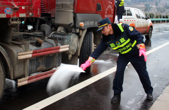 一方面,大隊(duì)迅速與轄區(qū)養(yǎng)護(hù)站溝通聯(lián)系,組織經(jīng)營(yíng)業(yè)主單位在橋梁、隧道等重點(diǎn)路段設(shè)置安全警示標(biāo)識(shí),提醒過(guò)往車輛注意路面情況,確保行車安全;另一方面,要求養(yǎng)護(hù)部門合理組織人員、車輛,由黃平路政執(zhí)法大隊(duì)護(hù)送對(duì)轄區(qū)全路段進(jìn)行抗凝撒鹽。