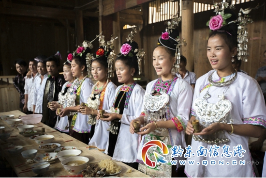貴客進(jìn)郎德上寨得按苗家禮俗喝攔路酒。從寨腳公路開始,到寨頭的進(jìn)寨門樓,設(shè)迎客攔路酒卡,多達(dá)12道。每道酒卡,在路中間放一張方桌,兩邊站著幾個(gè)身著盛裝的苗族男女青年,提壺端杯,向客人敬酒,每道兩土碗,表示福壽雙全。最后一道酒卡是進(jìn)寨門樓,土碗換成了大牛角。如此一路想滿飲進(jìn)寨者,非“海量”莫能。不過不善飲酒的客人也不必?fù)?dān)心,只要你雙手背在身后,彎腰用唇輕觸酒杯即離,并有禮貌他說一聲“兜社莫”(苗語“謝謝你”)就可以“過關(guān)”了。