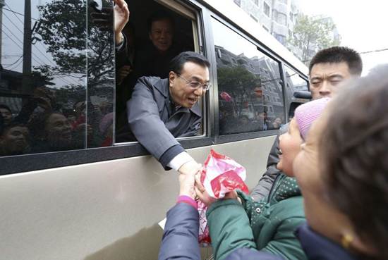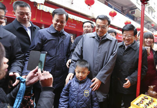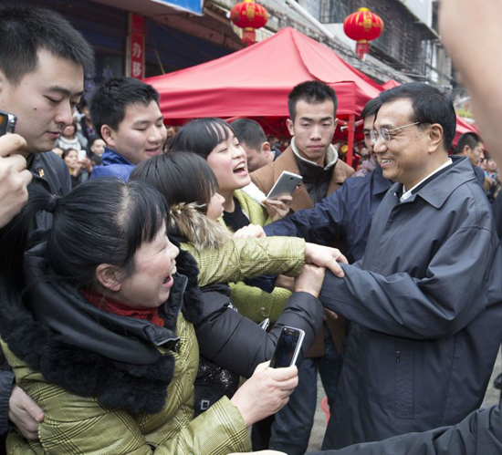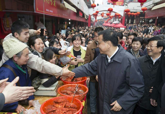 熱騰騰的糯米飯、此起彼伏的叫賣聲、摩肩接踵的趕集人。春節(jié)前貴州黎平大市場尤為熱鬧。13日現身這里的李克強邊看邊與群眾打招呼,詢問市場供應、公平交易和食品安全等,100多米街市走了20多分鐘。看著燈籠、春聯和各色年貨,總理贊嘆:還是縣城年味濃啊!