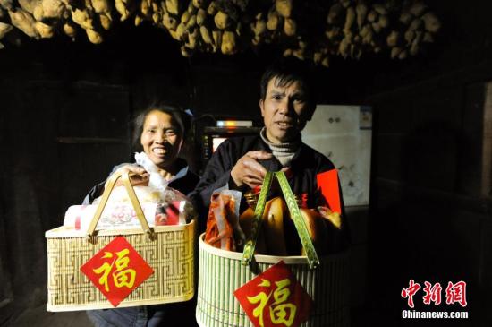 圖為蒲洞村民吳龍乾夫婦展示總理贈(zèng)送的年貨。中新社發(fā) 賀俊怡 攝