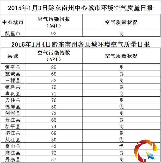 2015年1月4日黔東南州各縣(市)環(huán)境空氣質(zhì)量日?qǐng)?bào)