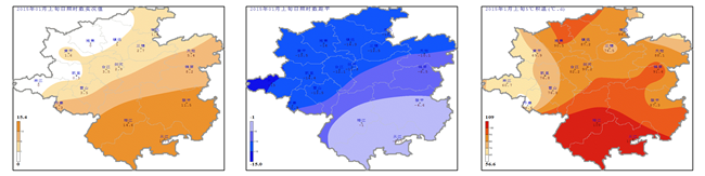 降水量:1月上旬我州各地降水量為15.5~31.7mm (圖2左);與歷年同期相比偏多4~156.6% (圖2中);旬內日降水量≥0.1mm的日數州的北部地區3~5d、中部地區6~7d、南部地區5天(圖2右),各地降水出現在5~10日,其中9日全州各地出現小到中雨,前期出現的旱象消除。