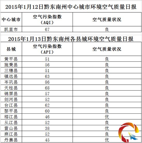 2015年1月13日黔東南州各縣(市)環(huán)境空氣質(zhì)量日報(bào)
