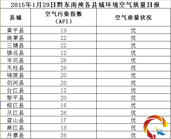 2015年1月29日黔東南州各縣(市)環境空氣質量日報