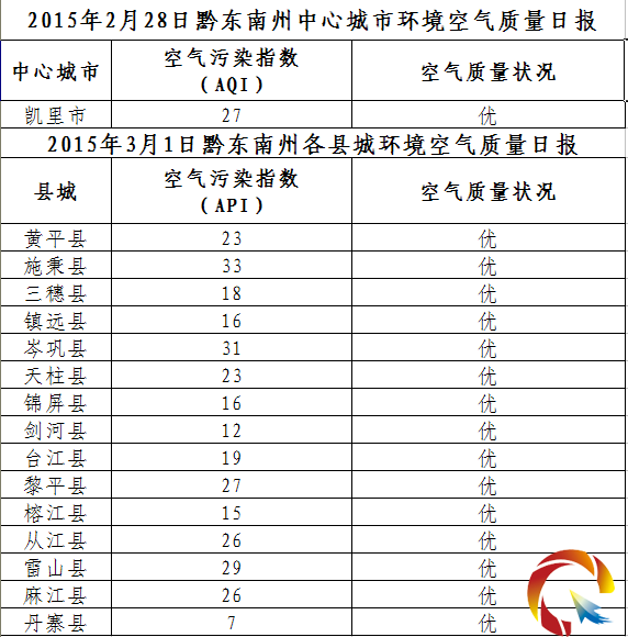 2015年3月1日黔東南州各縣(市)環境空氣質量日報