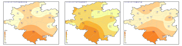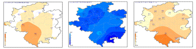氣溫:2月下旬我州各地平均氣溫6.6~12.5℃ (圖1左),與歷年同期相比偏高0.3~1.9℃(圖1中);旬極端最低為2.2~8.4℃(圖1右),出現(xiàn)在28日。除28日外,其余時(shí)間各地日平均氣溫均維持在5℃以上。
