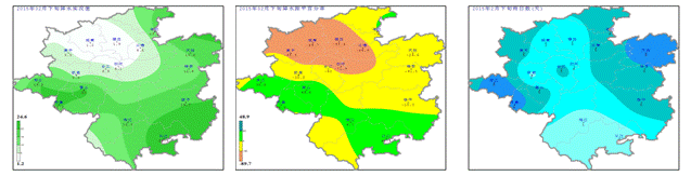 降水量:2月下旬我州各地降水量為1.2~24.6mm (圖2左);與歷年同期相比麻江、丹寨、雷山、榕江、從江偏多4.7~48.9%,其余地區(qū)偏少5.0~89.7% (圖2中);旬內(nèi)日降水量≥0.1mm的日數(shù)1~8d (圖2右),較強(qiáng)降水主要出現(xiàn)在21日,麻江、丹寨、天柱出現(xiàn)了持續(xù)陰雨天氣。
