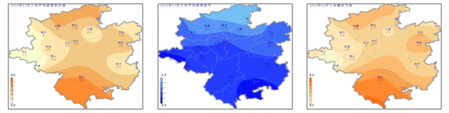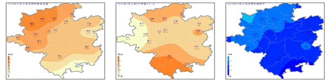 降水量:3月上旬我州各地降水量為4.3~24.7mm (圖2左);與歷年同期相比黎平偏多5.6%,其余地區(qū)偏少14.9~66.4% (圖2中);旬內(nèi)日降水量≥0.1mm的日數(shù)4~9d (圖2右),旬內(nèi)各地以低溫降雨天氣為主,但降雨強度小,沒有中雨以上天氣出現(xiàn)。