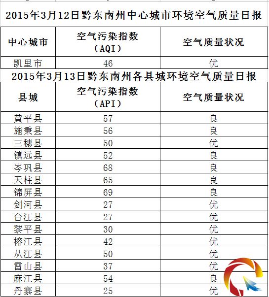 2015年3月13日黔東南州各縣(市)環境空氣質量日報