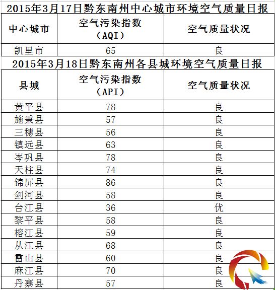 2015年3月18日黔東南州各縣(市)環境空氣質量日報