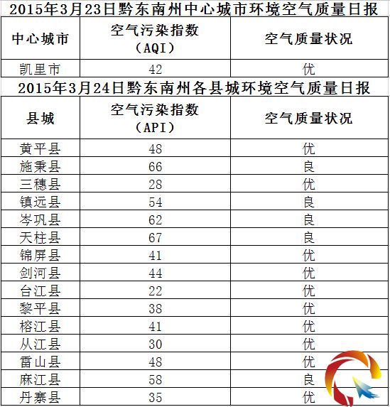 2015年3月24日黔東南州各縣(市)環境空氣質量日報