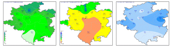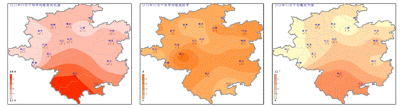 日照、積溫:3月下旬日照時(shí)數(shù)12.8~26.1h (圖3左),與歷年同期相比凱里、黃平、施秉、鎮(zhèn)遠(yuǎn)、三穗、劍河、黎平、天柱偏多0.4~5.7h,其余大部地區(qū)偏少0.9~7.4h (圖3中);≥10℃的活動(dòng)積溫為133.3~197.9℃·d (圖3右)。