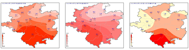降水量:4月上旬我州各地降水量為2.2~31.4mm (圖2左);與歷年同期相比偏少4.8~92.8 % (圖2中);旬內日降水量≥0.1mm的日數2~7d (圖2右),旬內降水主要集中在7日,全州普降小到中雨。