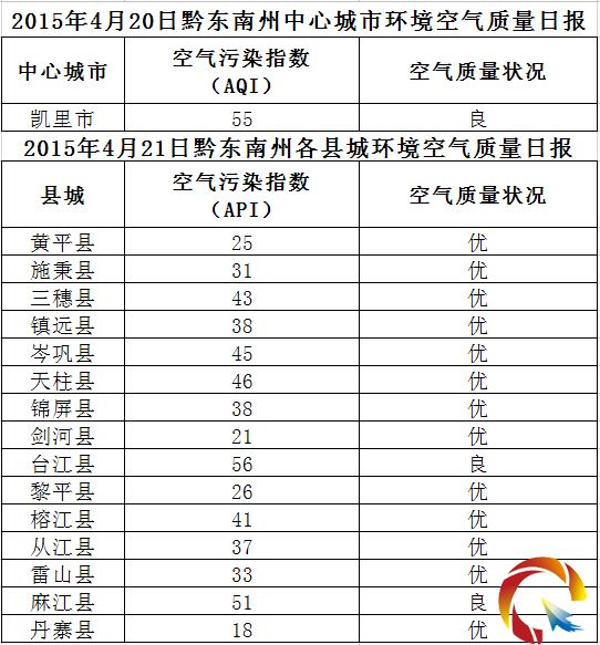 2015年4月21日黔東南州各縣(市)環(huán)境空氣質(zhì)量日報